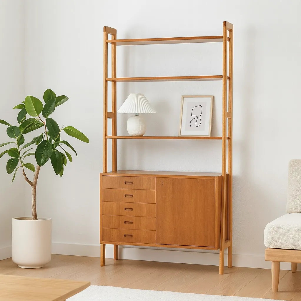 スウェーデンで買い付けた、北欧デザインらしいシンプルで機能的な ヴィンテージ ブックシェルフ。上部は3段の棚でディスプレイや収納に、下部は引き出しと扉付き収納で実用性を兼ね備えたデザインです。