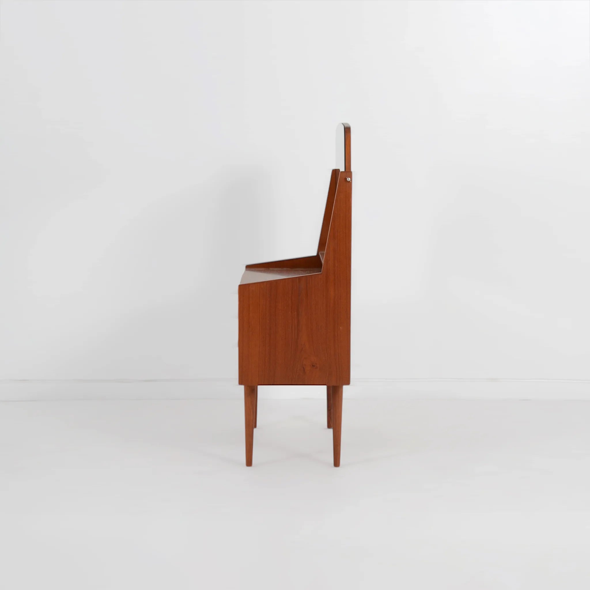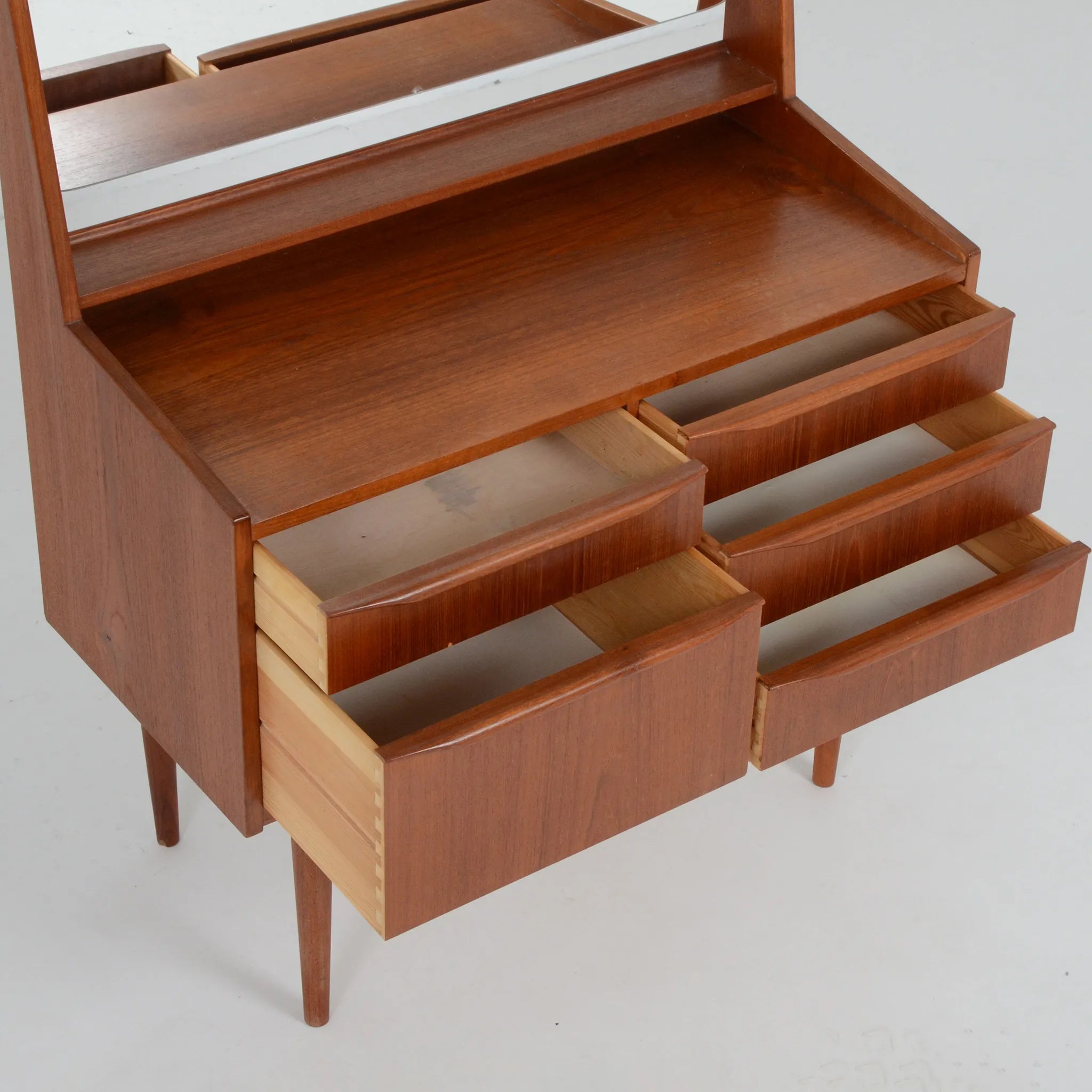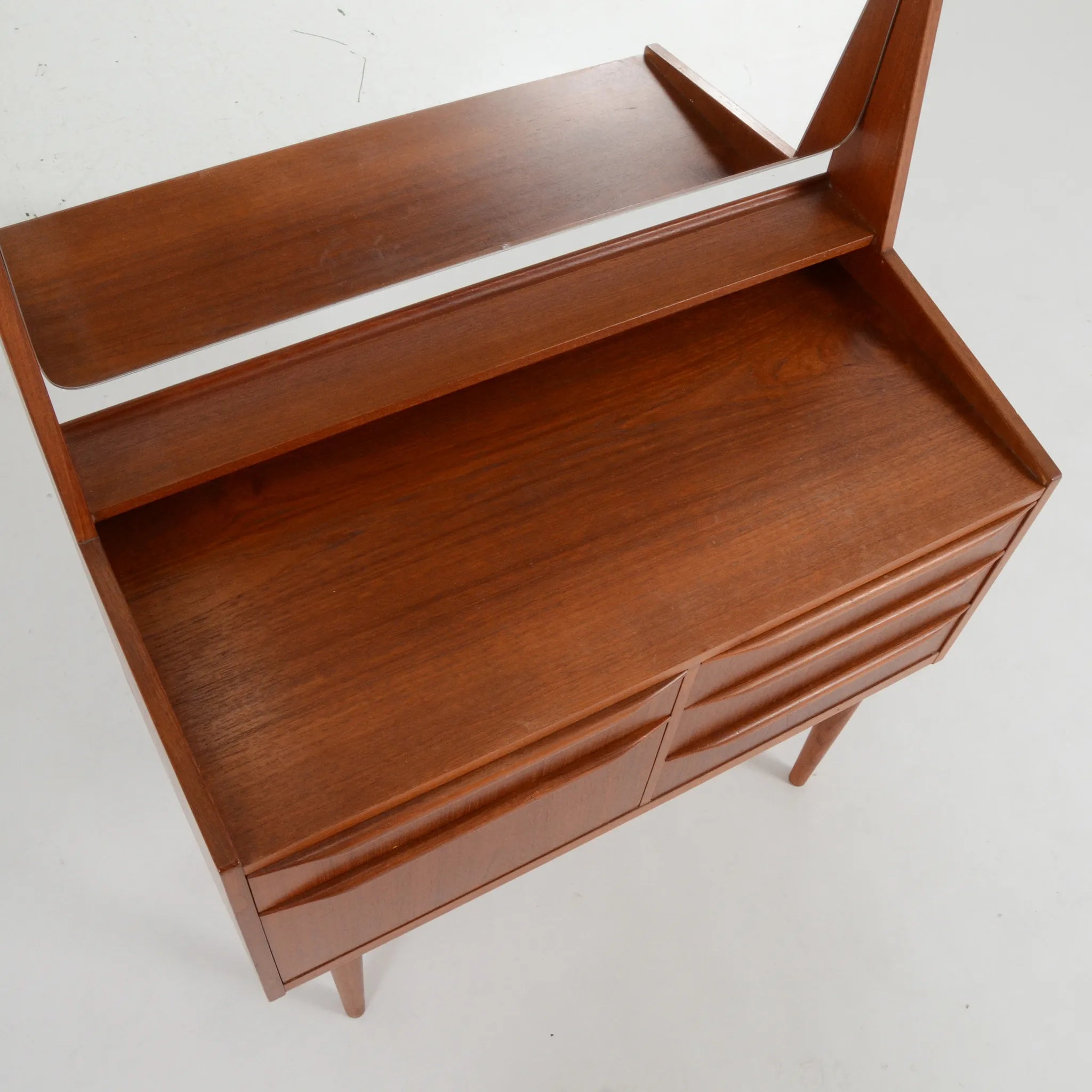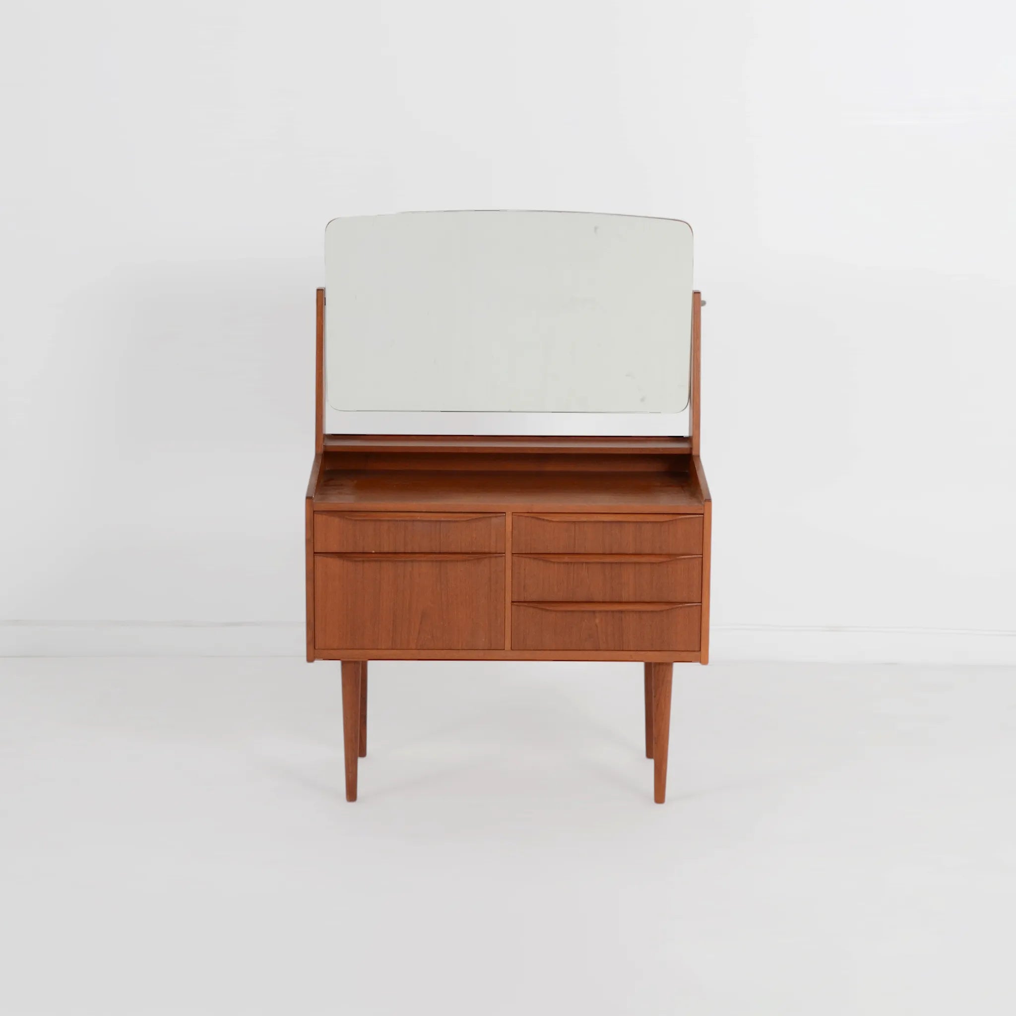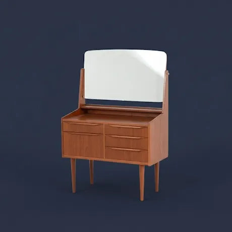 すっきりとしたデザインで、可愛らしいドレッサー。全体的に面取りがされており、シンプルながらも柔らかな印象を受けます。コンパクトでありながら収納力も抜群。大きなミラーも、室内の風景を映し込んで奥行きのある空間を作り出してくれ、お部屋も明るく見せてくれます。