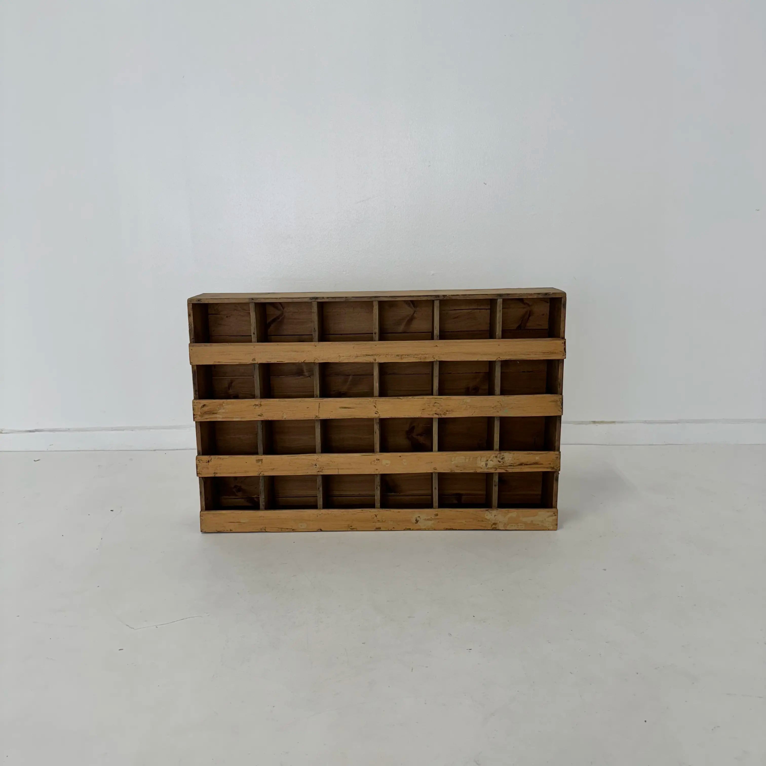 1980年代に、郵便物の仕分けに使われていた木製ボックス。24個に区切られた小さな空間に何を入れるかはアイデア次第。アクセサリーやお気に入りの小物など、自分だけのコレクションアイテムを飾って、お部屋に特別な空間を作り上げてくれます。ショップの什器としてもおすすめです。
