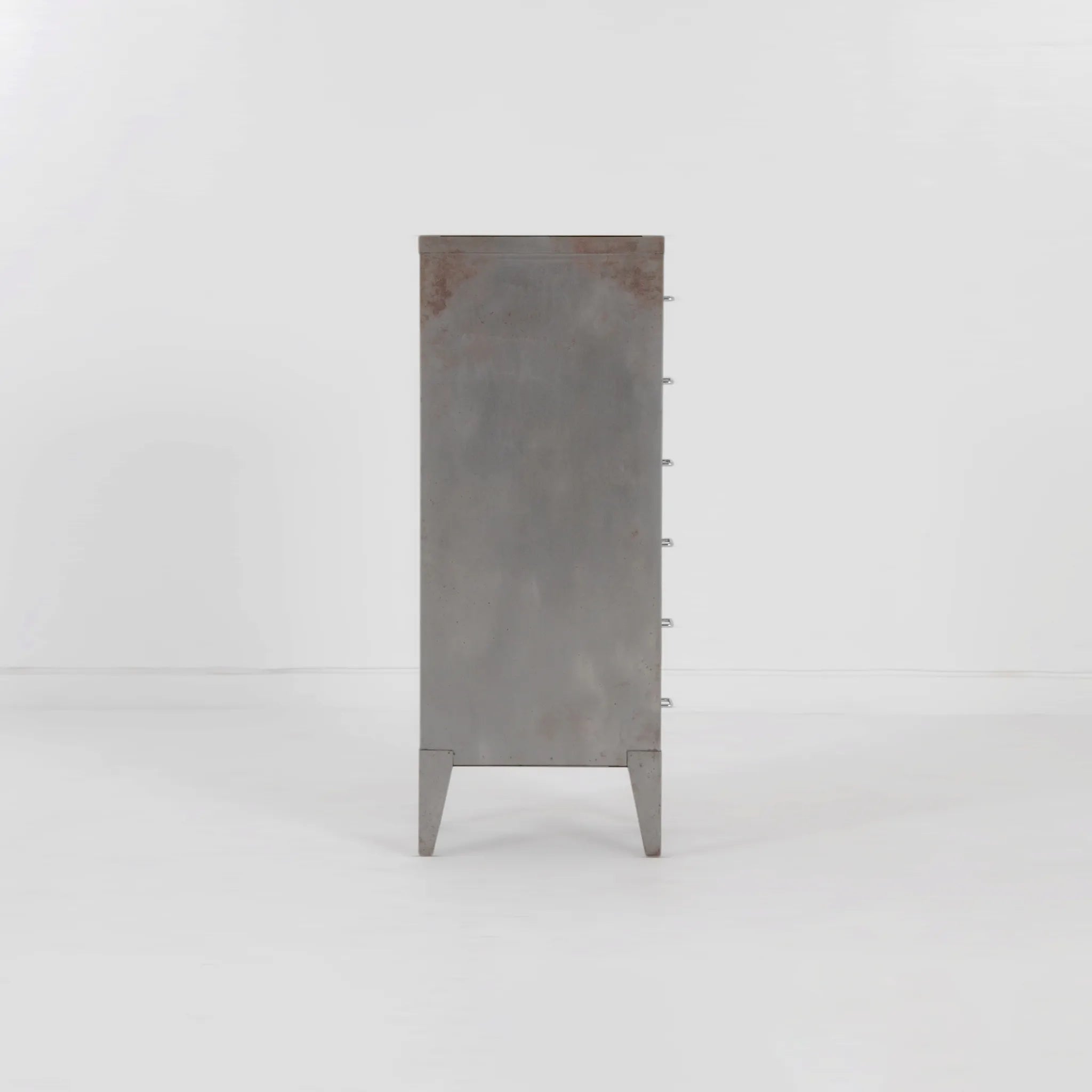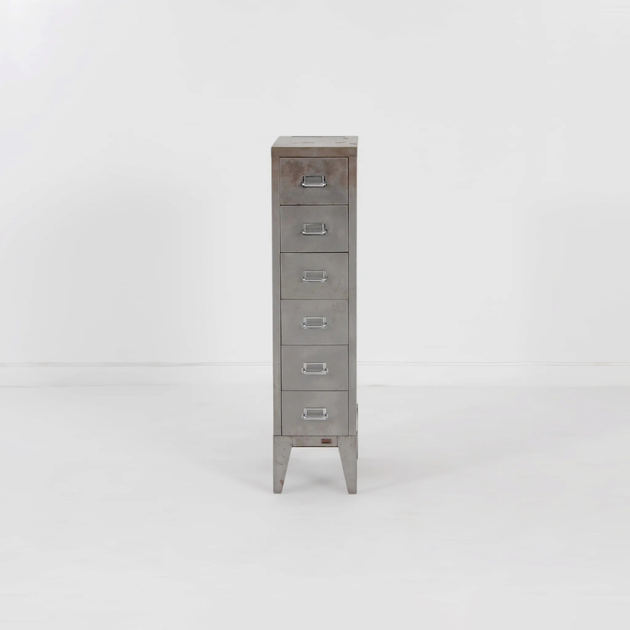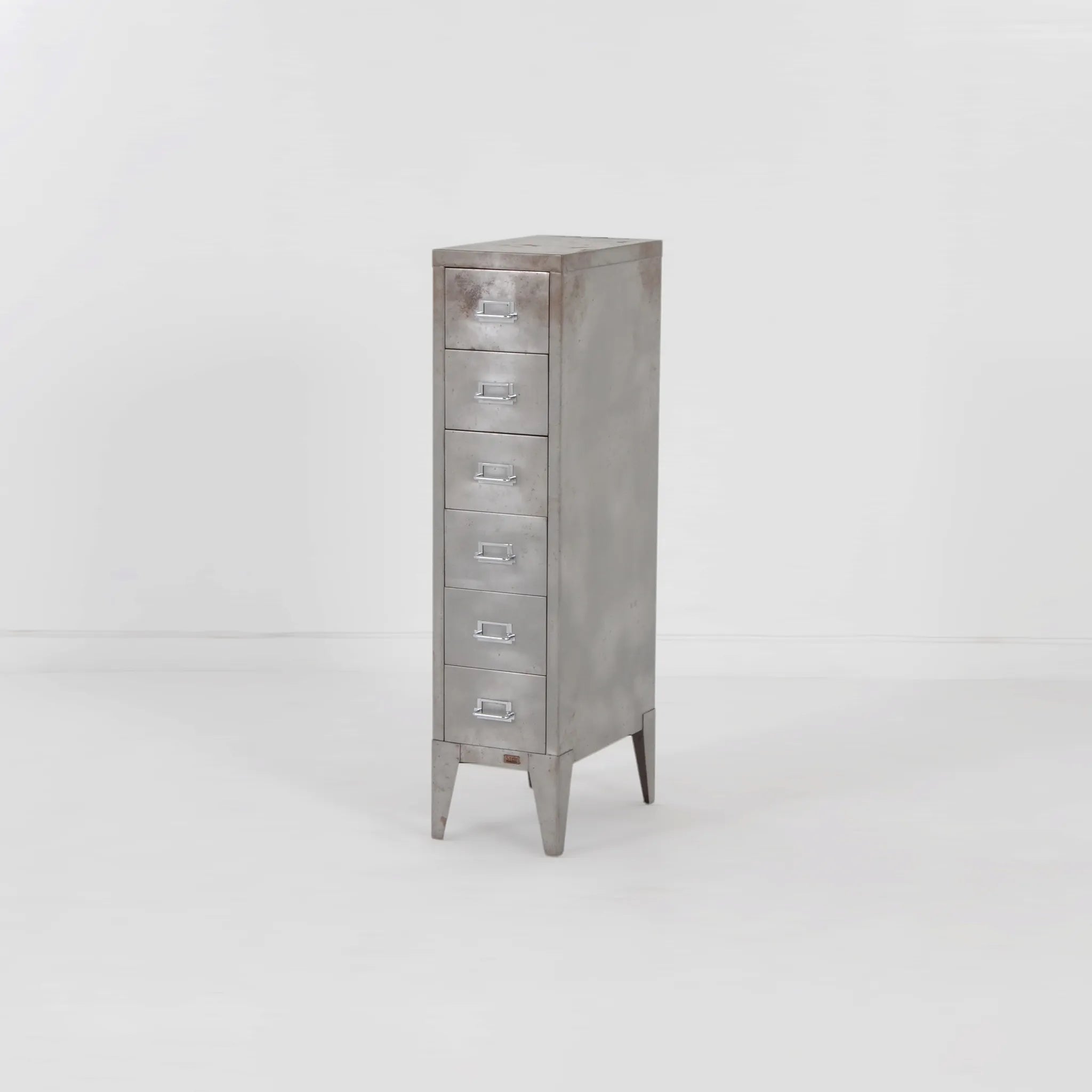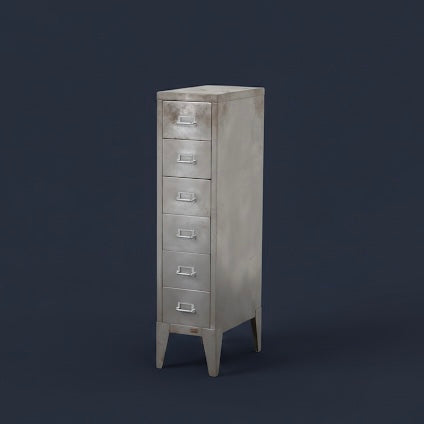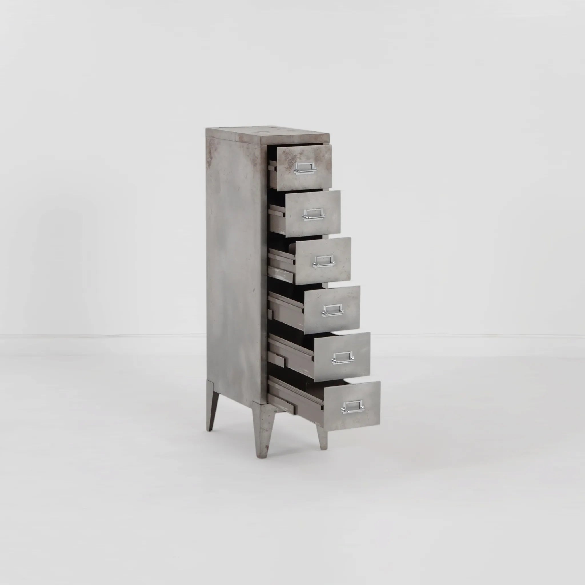 インダストリアルなメタルキャビネットは、6段の引き出し付き、幅は24cmとコンパクトで、隙間にすっぽり収まるサイズ感です。オフィス、ショップ用の什器としても、使用頻度の高い備品や書類などを分類してたっぷり収納でき、実用性も抜群です。