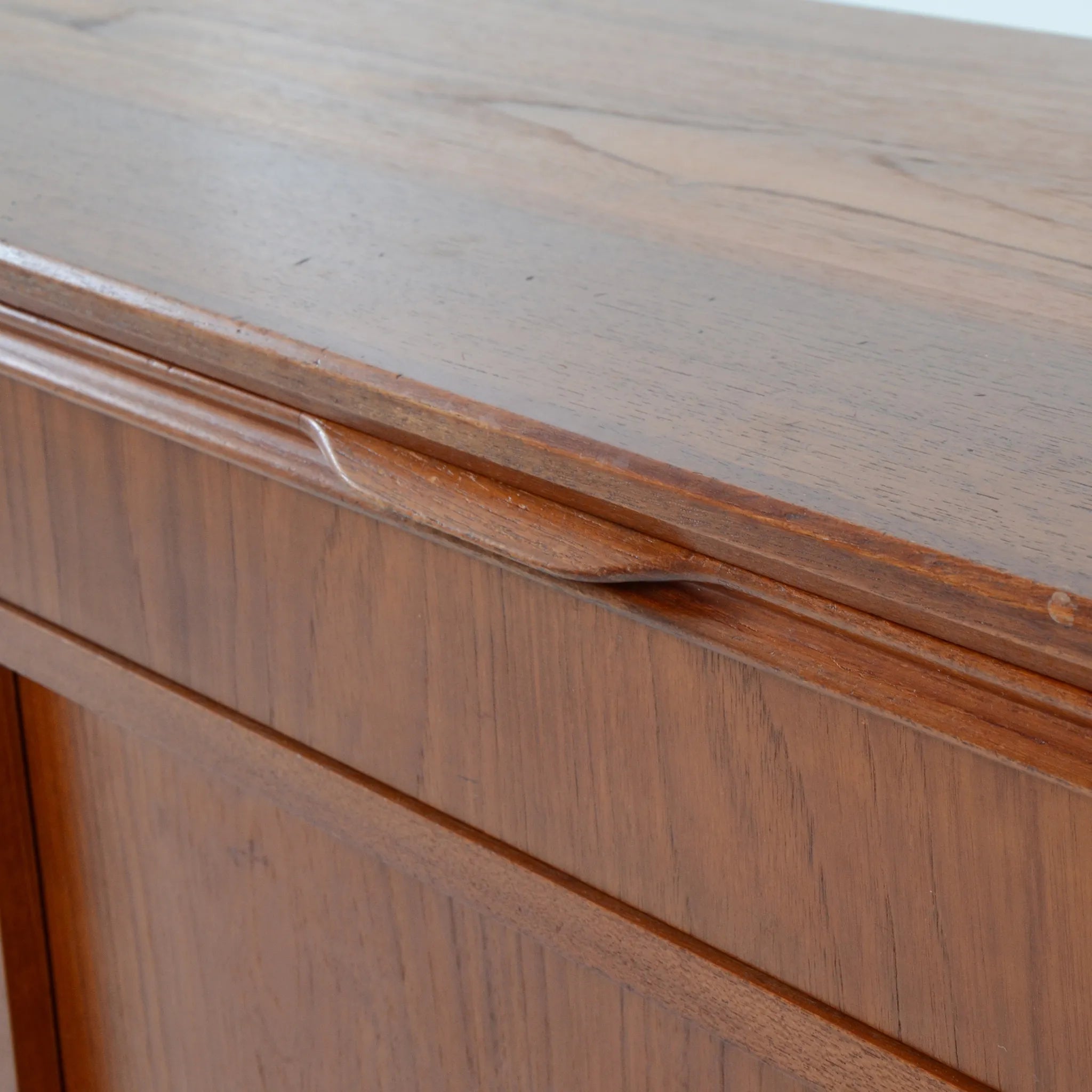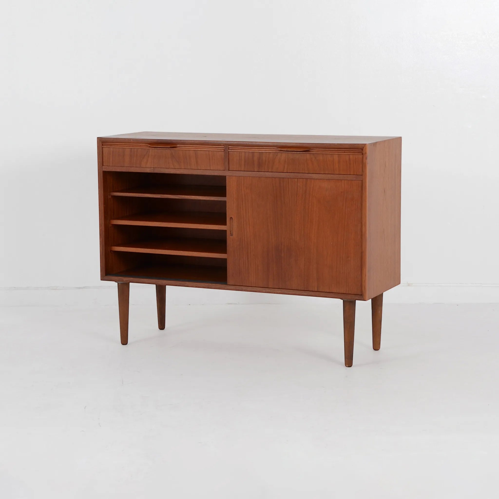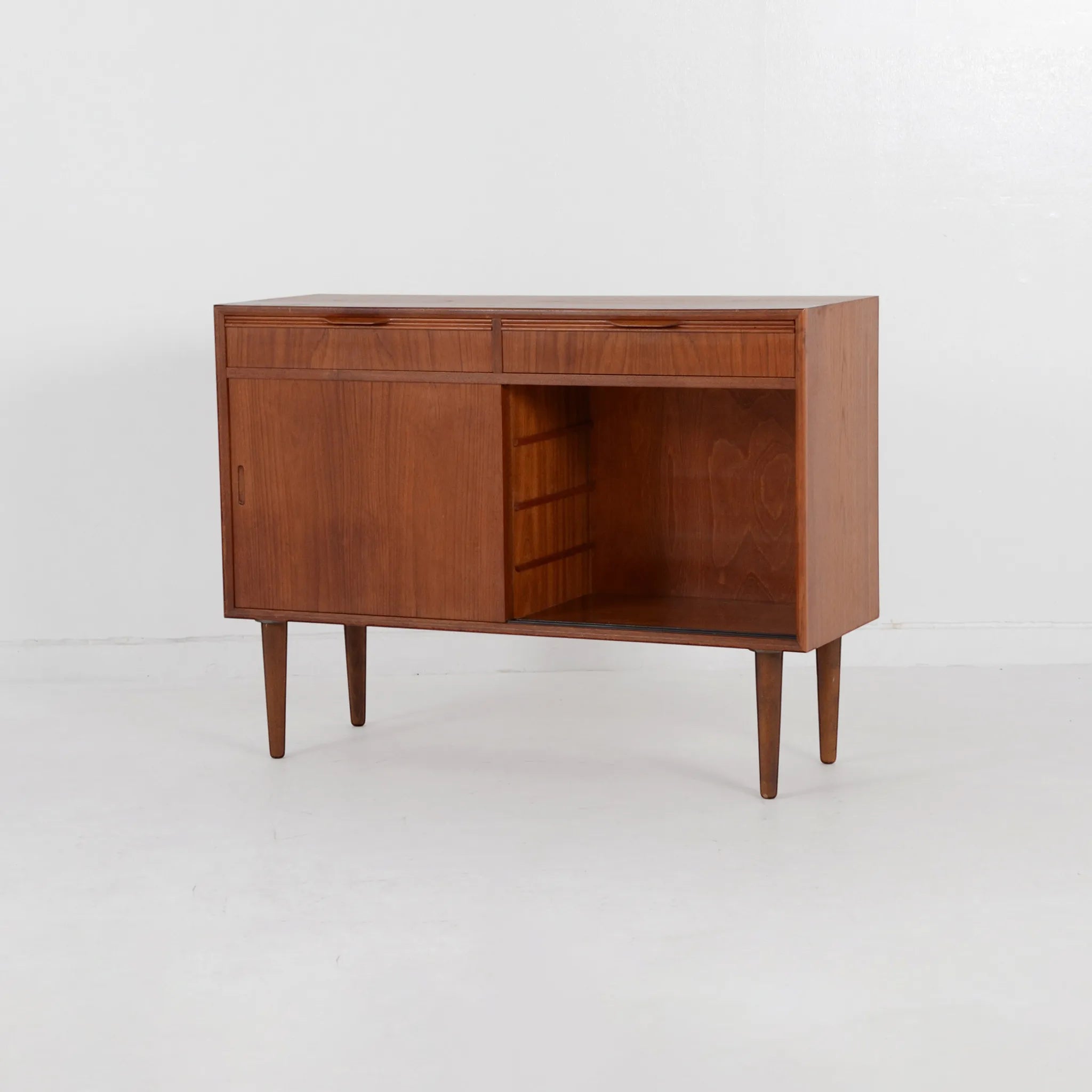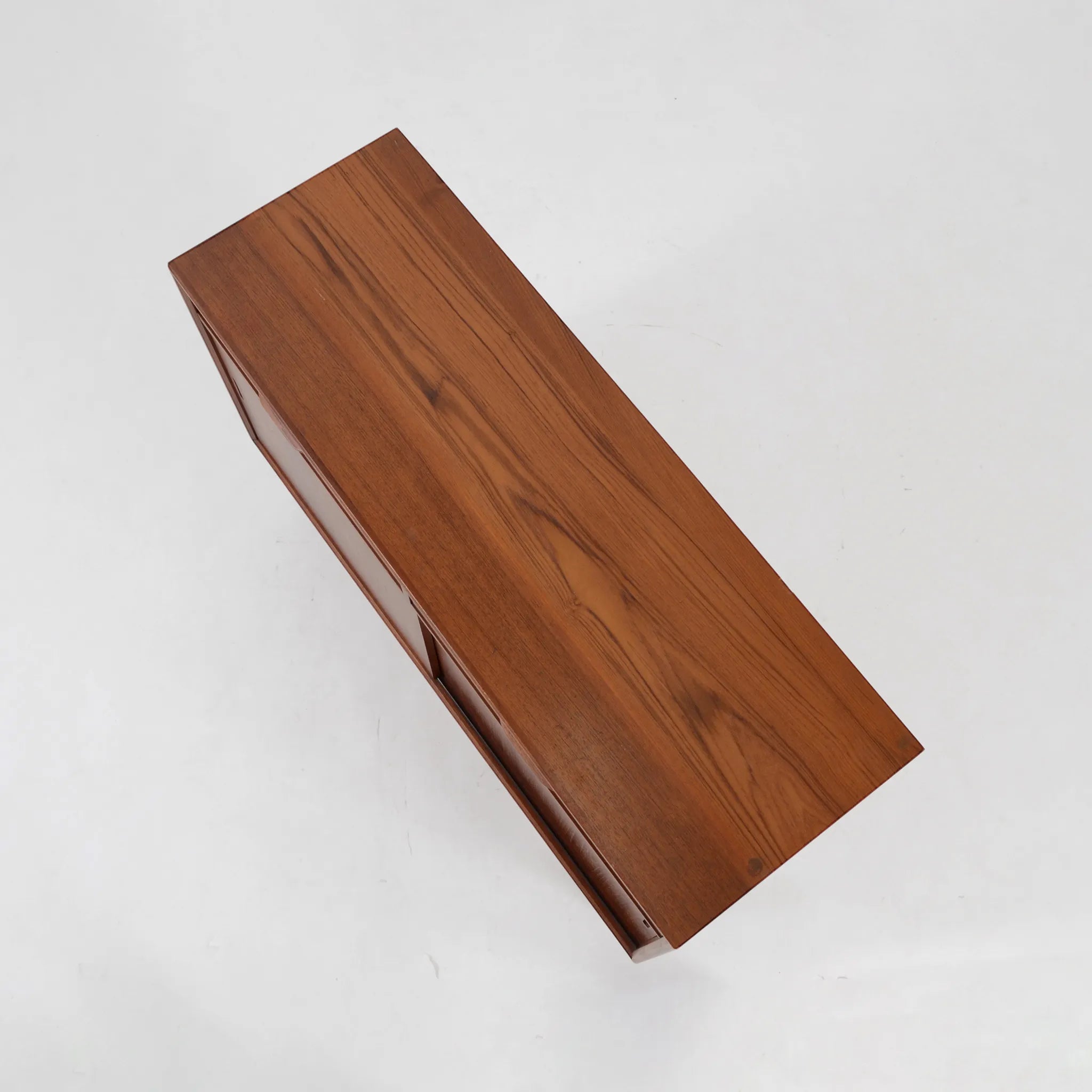 デンマークのオフィス家具メーカー、Bjerringbro Kontor Mobler社のキャビネット。選び抜かれた美しい木目から上品さを感じます。扉の取っ手は掘り込み式のシンプルな形状ですが、より木目を美しく感じさせるための技術のひとつであり、手の込んだ接合部分の造りとともに、こちらの会社の特徴的ディテールです。棚板枚数も多いので、細かくきれいに整理整頓できそうです。