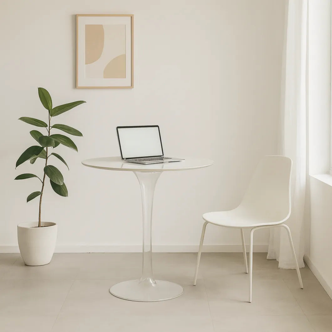 ラウンド型の天板とスリムな一本脚が繋がるデザインは、Kartell ならではのプラスチック成形技術を活かしたもの。まるでガラスのように透き通った素材感は、空間に軽やかさとモダンな雰囲気を添えてくれます。