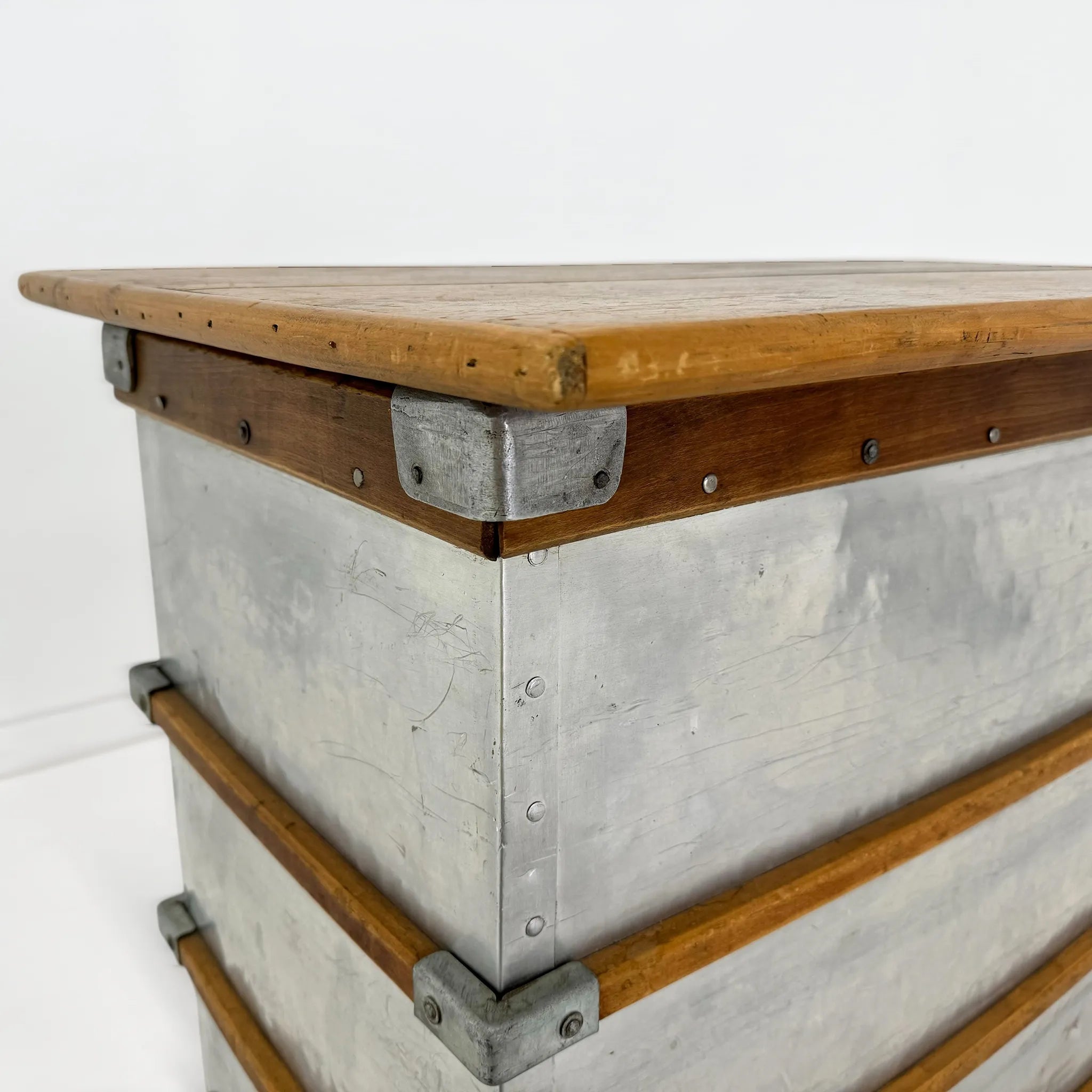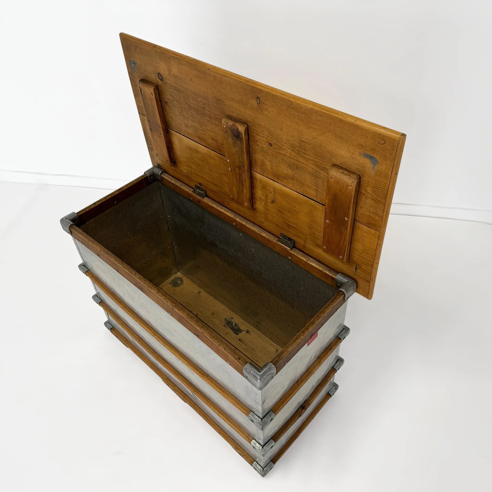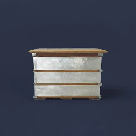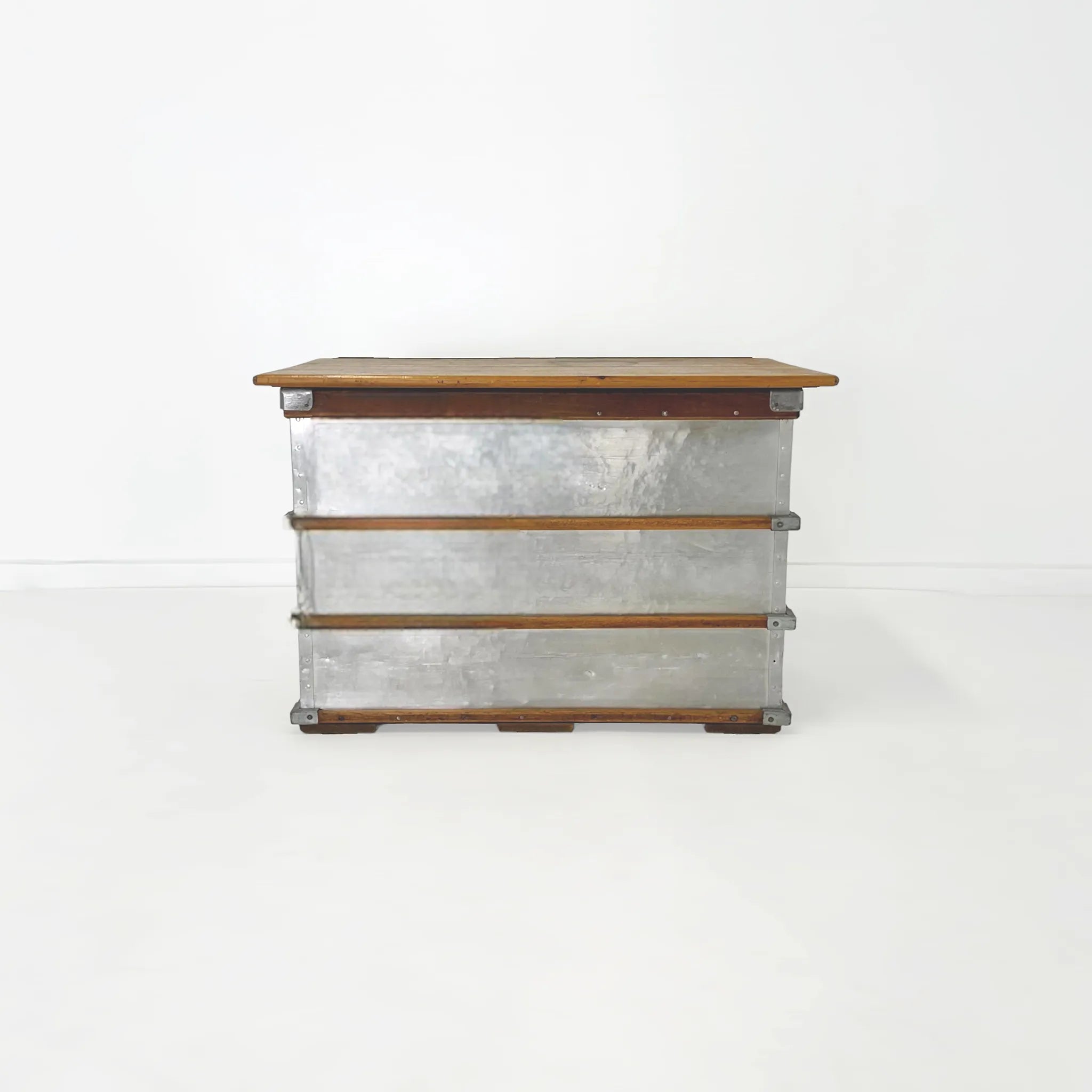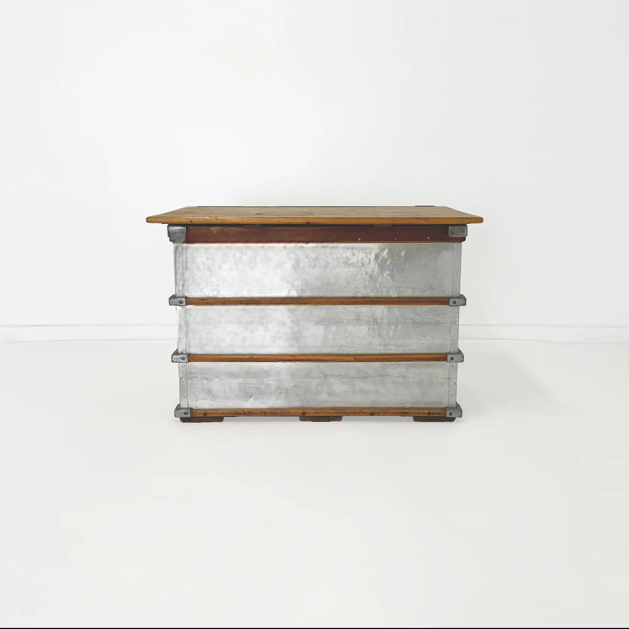 アルミとウッドを組み合わせた、ごくシンプルなつくりのストレージ。フタにもボックス部分にもしっかりと施されている補強が、デザイン上のアクセントにもなっています。仕切りがないので、大物ツール類やシーズンオフのファブリック、おもちゃなどもたっぷり入ります。普段は壁付けで作業台として使ったり、アイランド使用でカウンターテーブルのように使っても◎