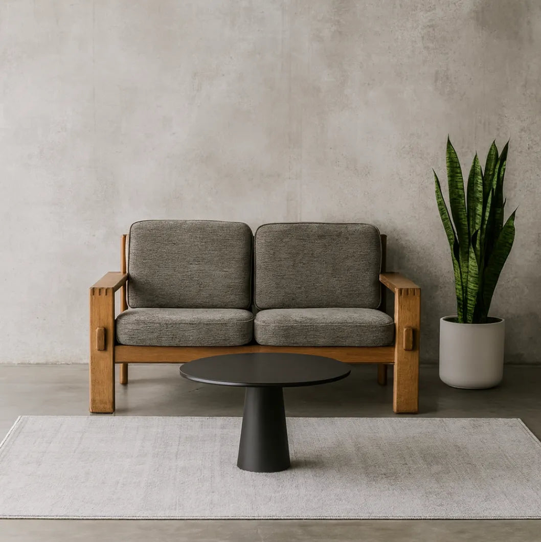 程よく経年変化したフレームと、ウォームグレーのクッションが柔らかい印象です。しっかりとした見た目を裏切ることなく、ゆったりとお座りいただけます。