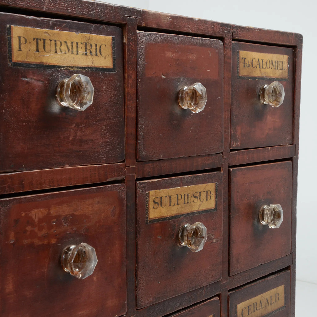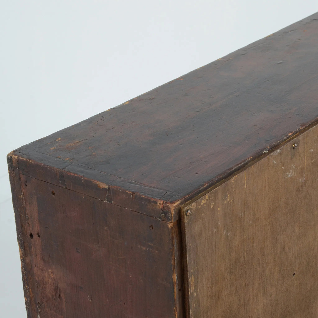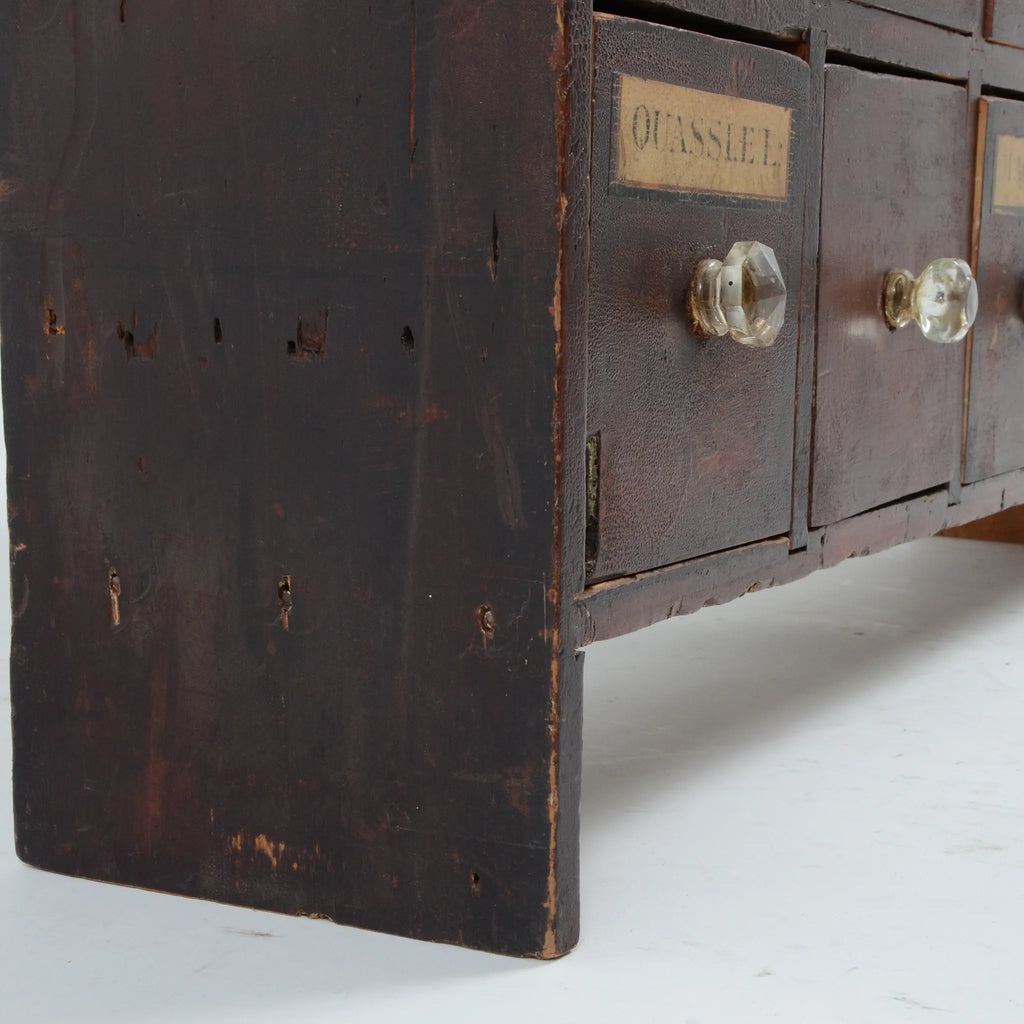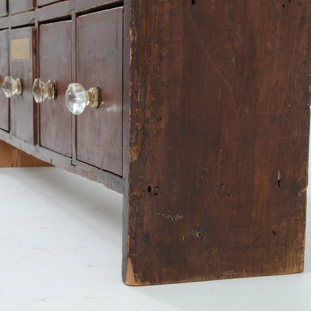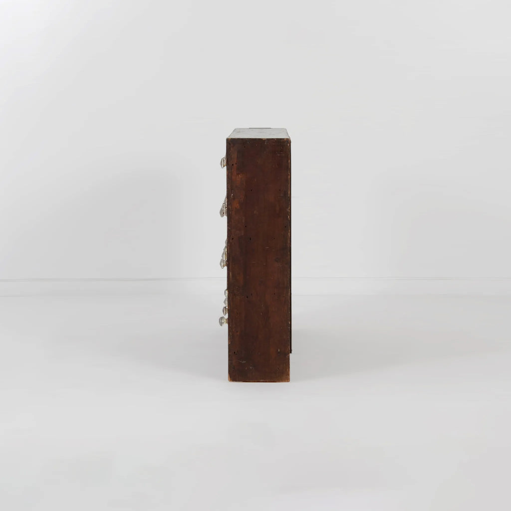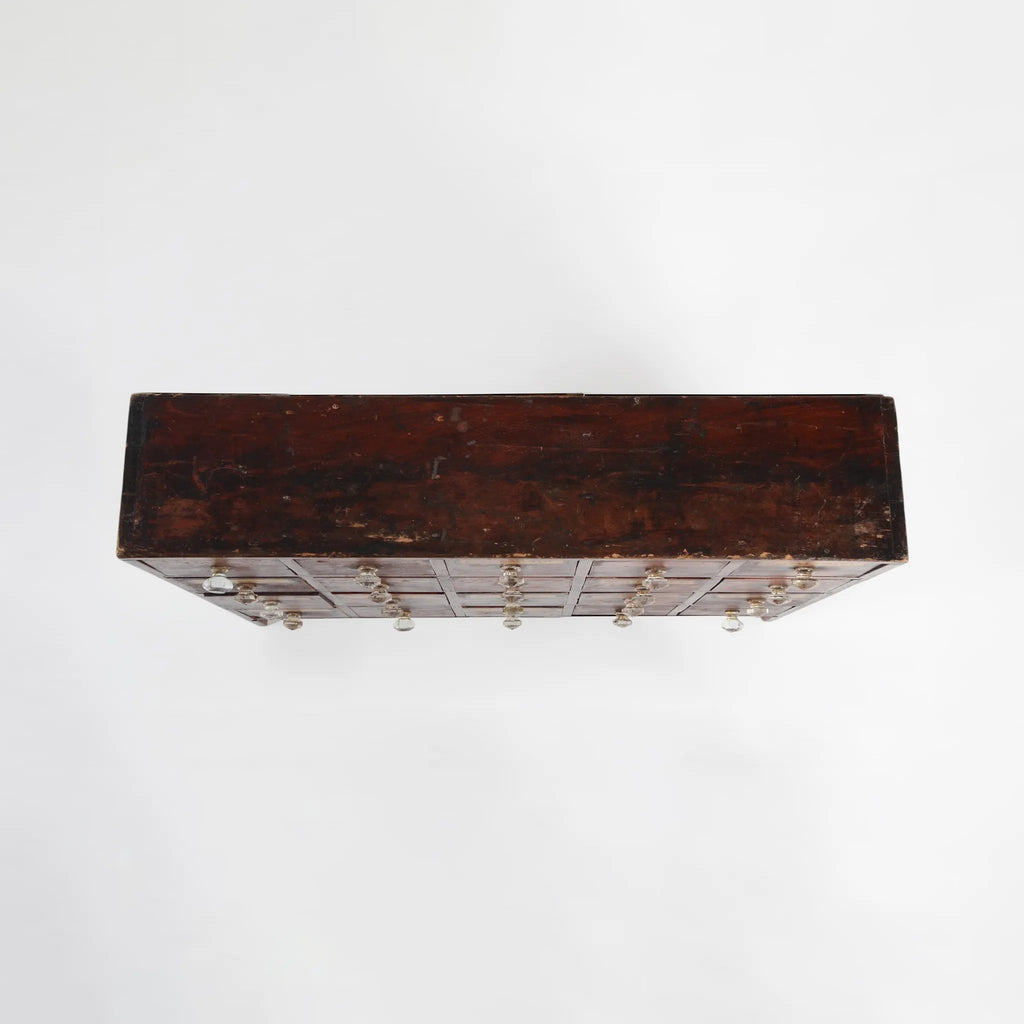 深みのあるブラウンの木肌と、使い込まれた真鍮ラベルやガラスノブの組み合わせが印象的。ひとつひとつの引き出しに刻まれた時間の痕跡が、このキャビネットの唯一無二の魅力を物語ります。