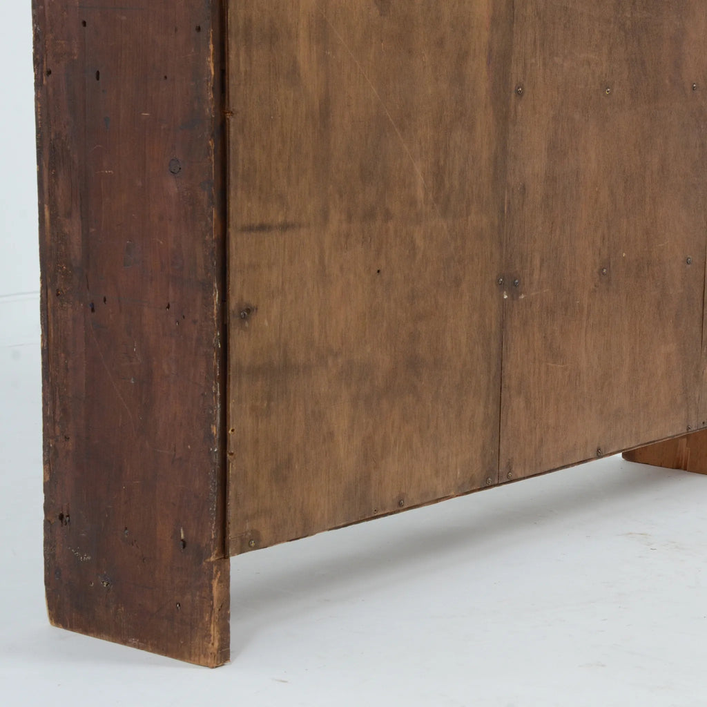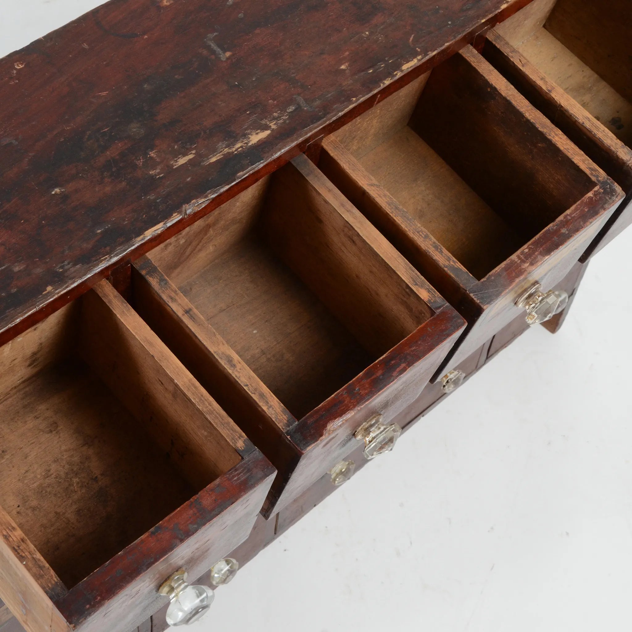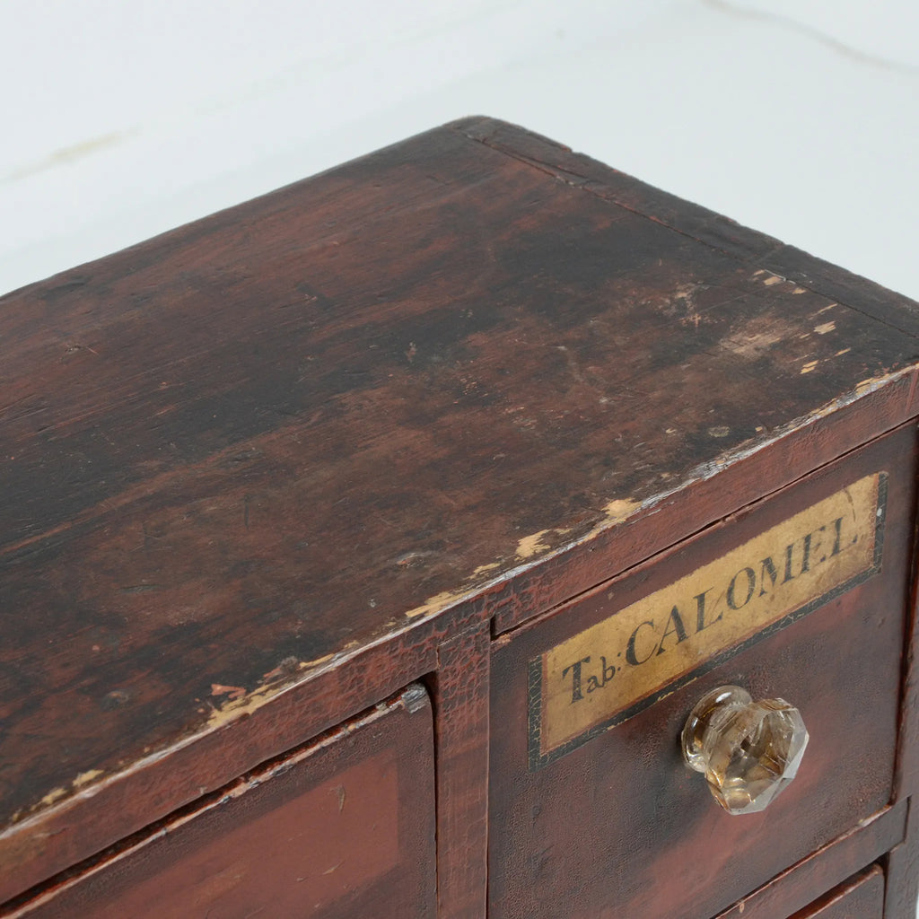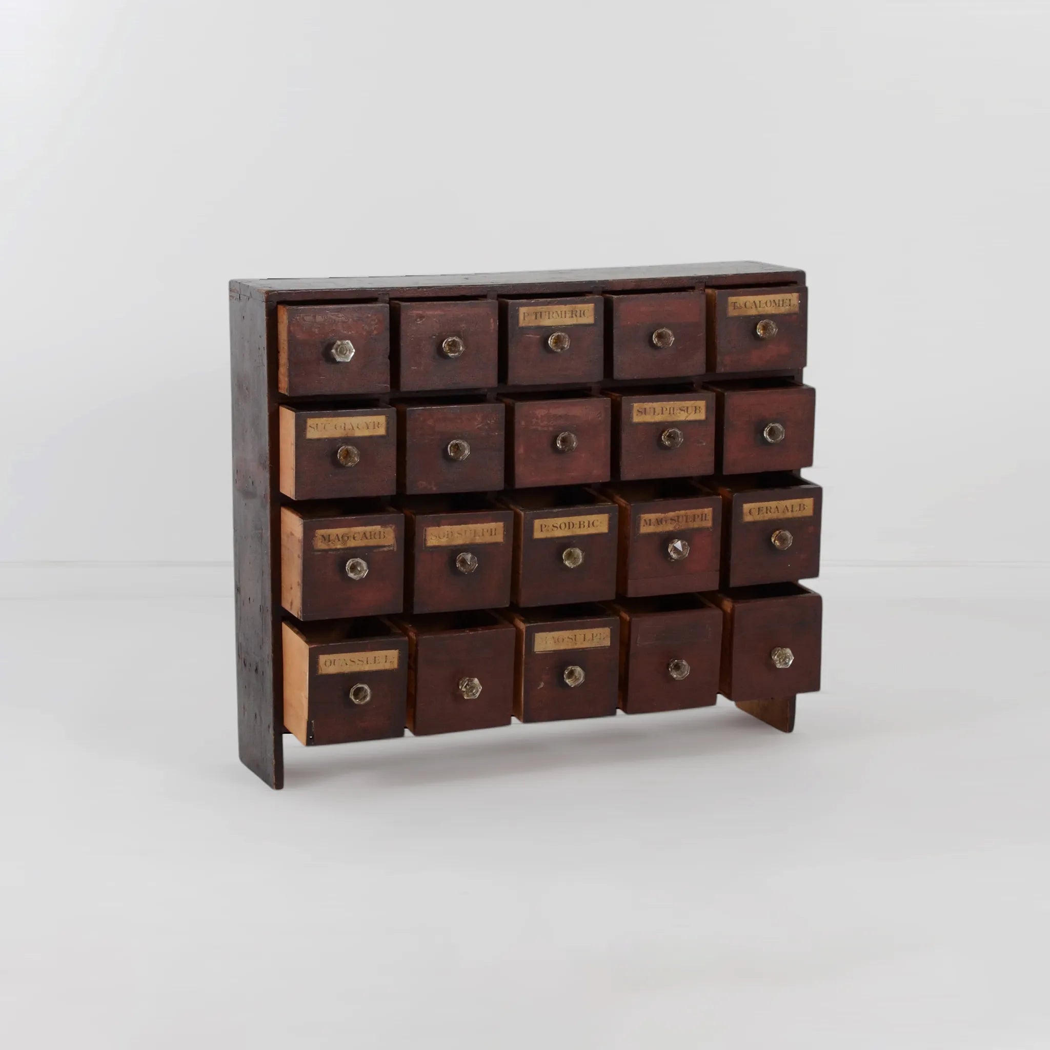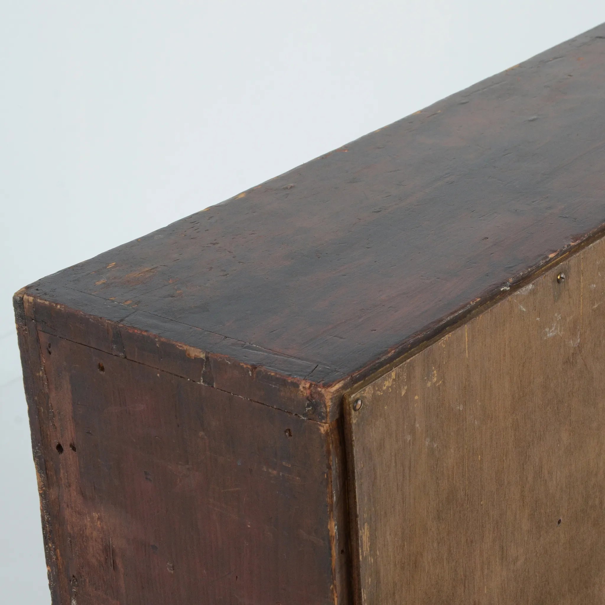 深みのあるブラウンの木肌と、使い込まれた真鍮ラベルやガラスノブの組み合わせが印象的。ひとつひとつの引き出しに刻まれた時間の痕跡が、このキャビネットの唯一無二の魅力を物語ります。