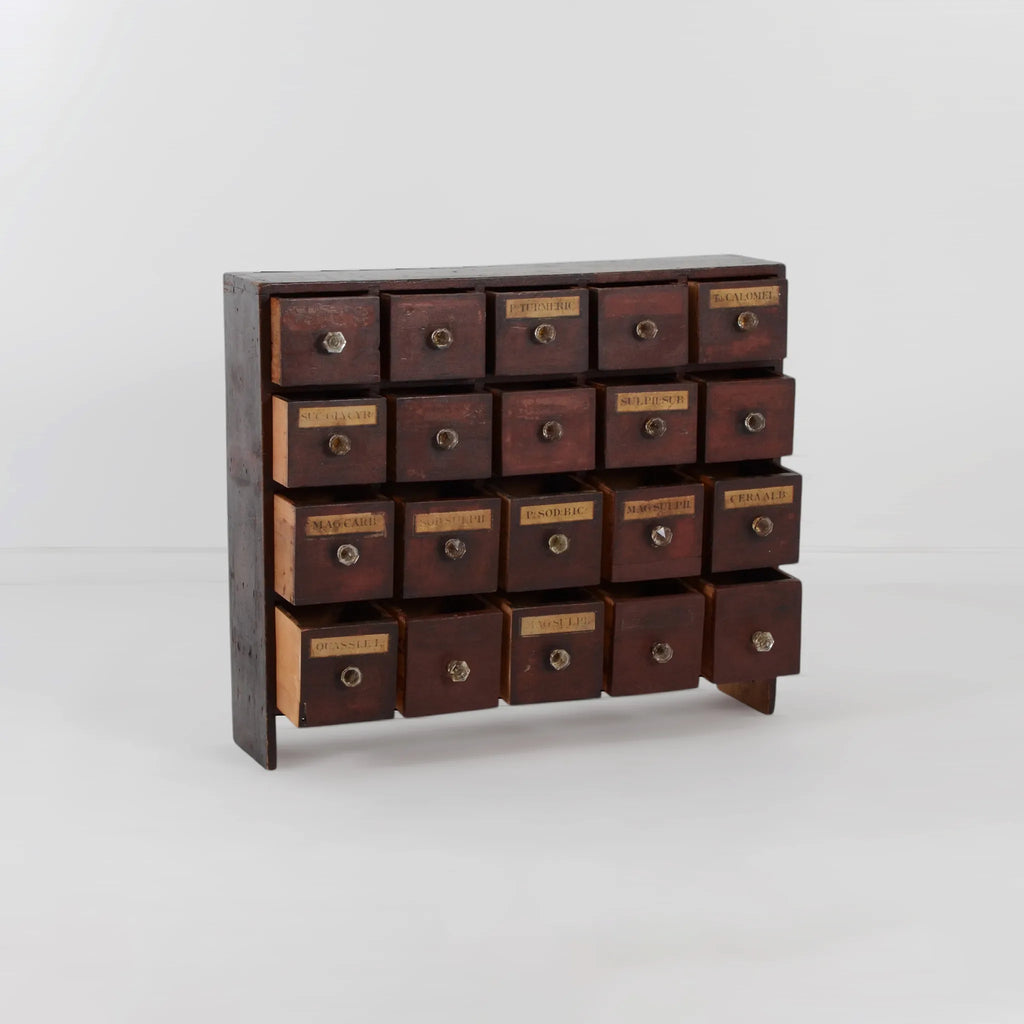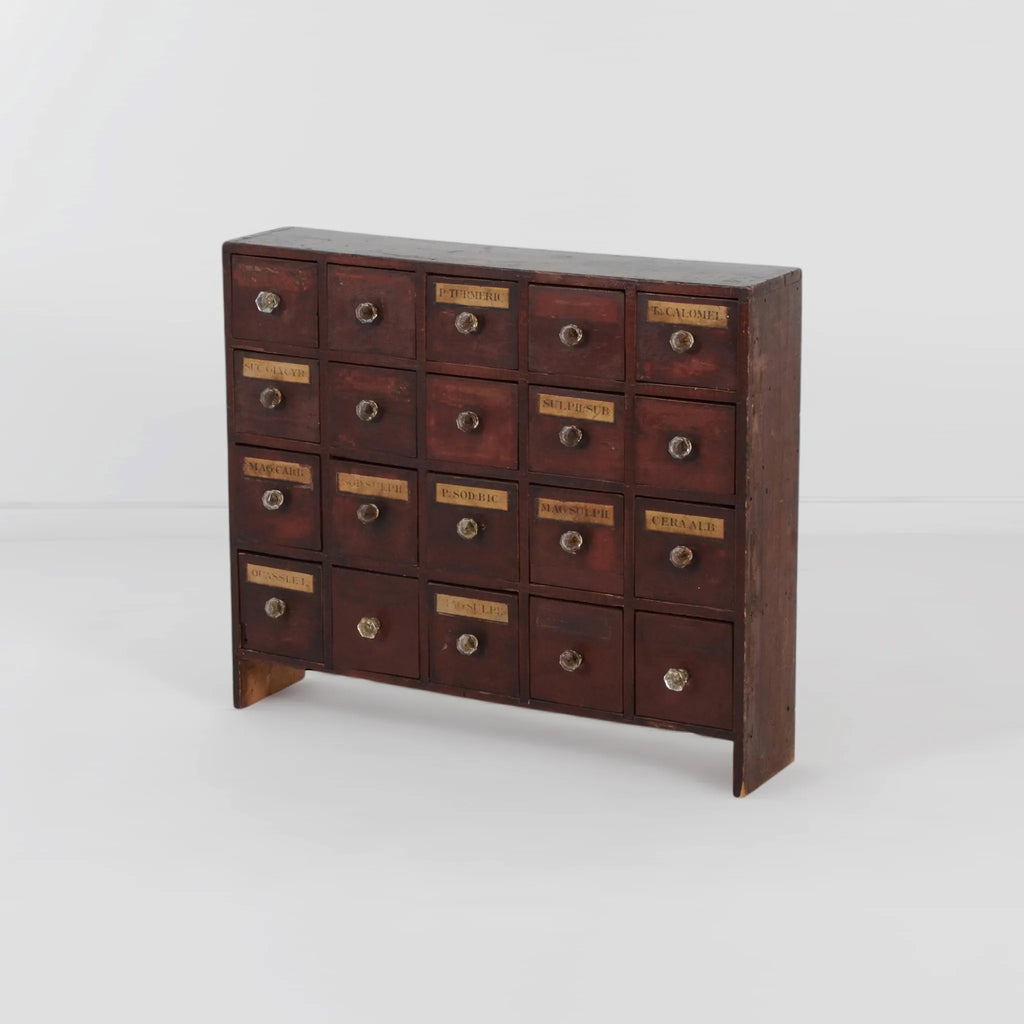 イギリスで買い付けた、重厚感と味わい深さが際立つ アンティーク メディシンキャビネット。もともとは薬局や医療施設などで薬品やハーブを収納するために使われていたもので、現在ではその希少性とデザイン性の高さからインテリアとしても高く評価されています。